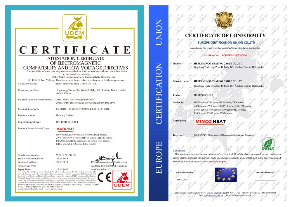 Hefei Minco Heating Cble Company is specilized in manufacturing heating cables, heating mat for many years. MINCO HEAT brand products are certificated by CE and RoHS authority.