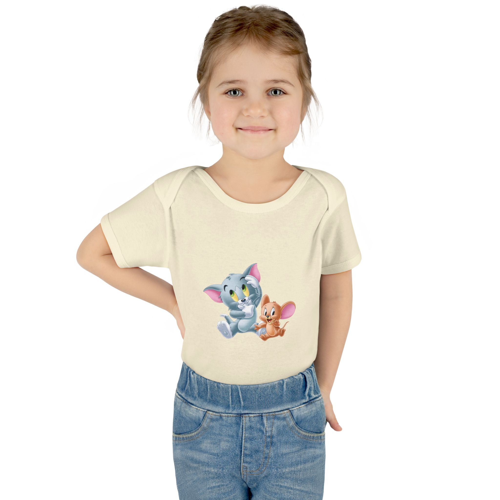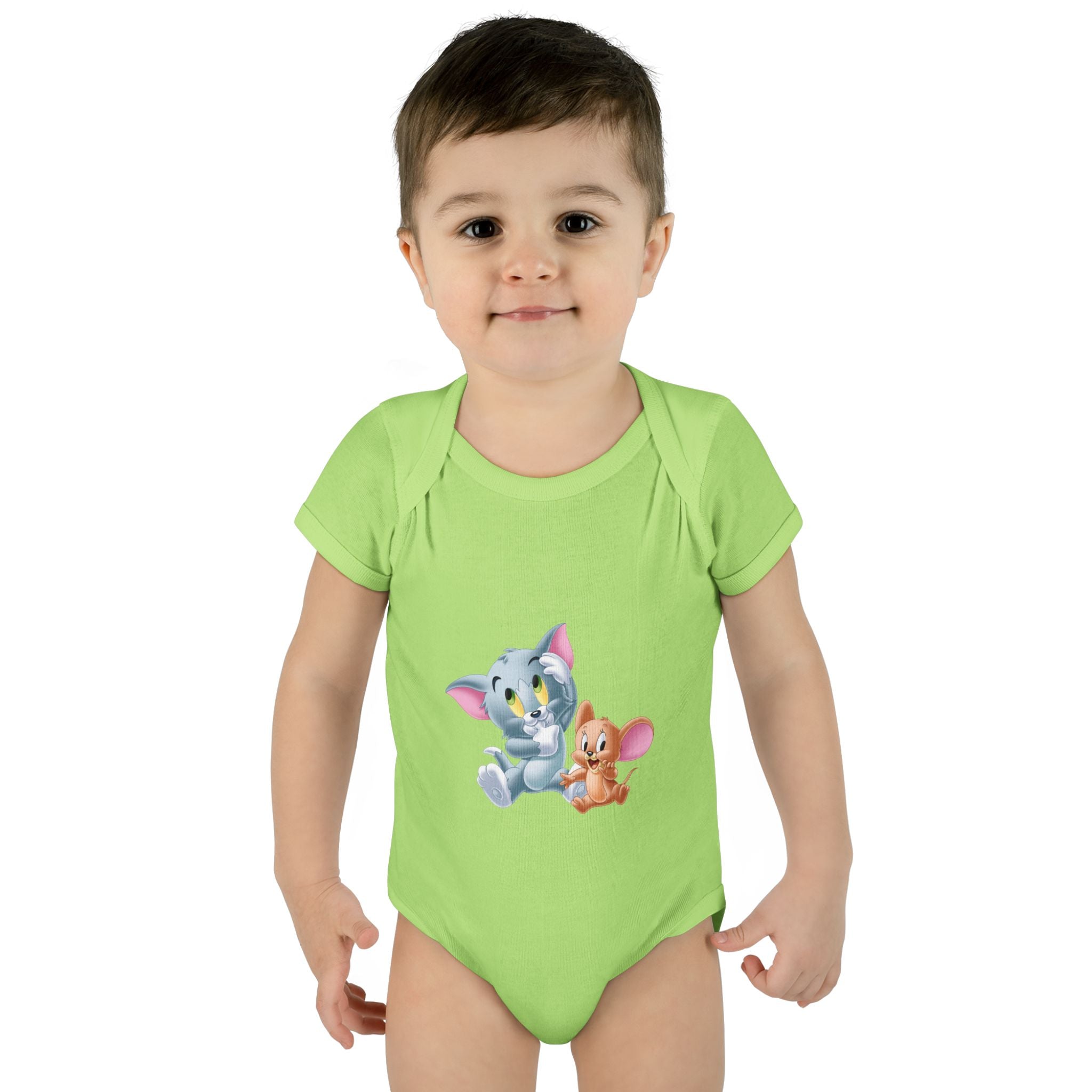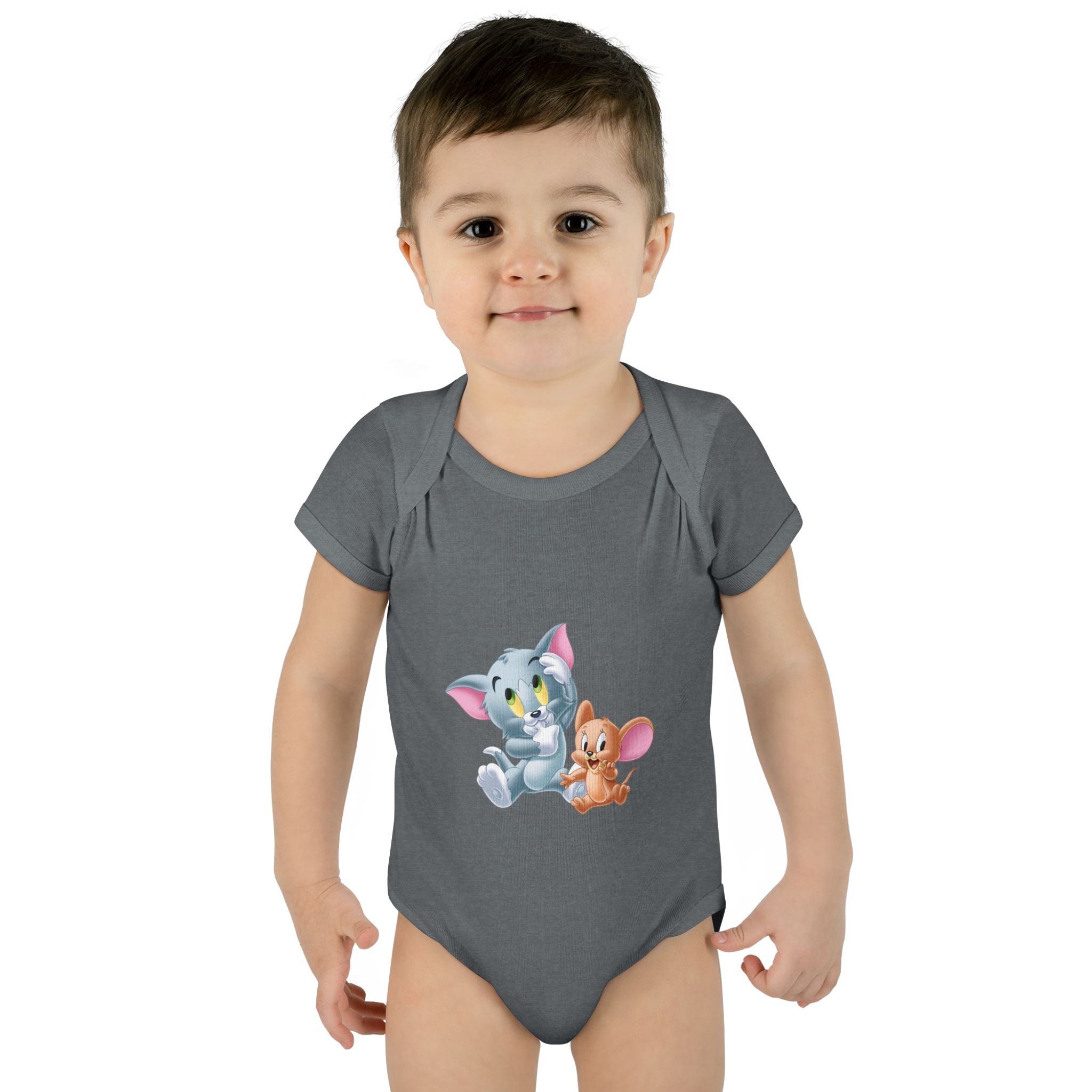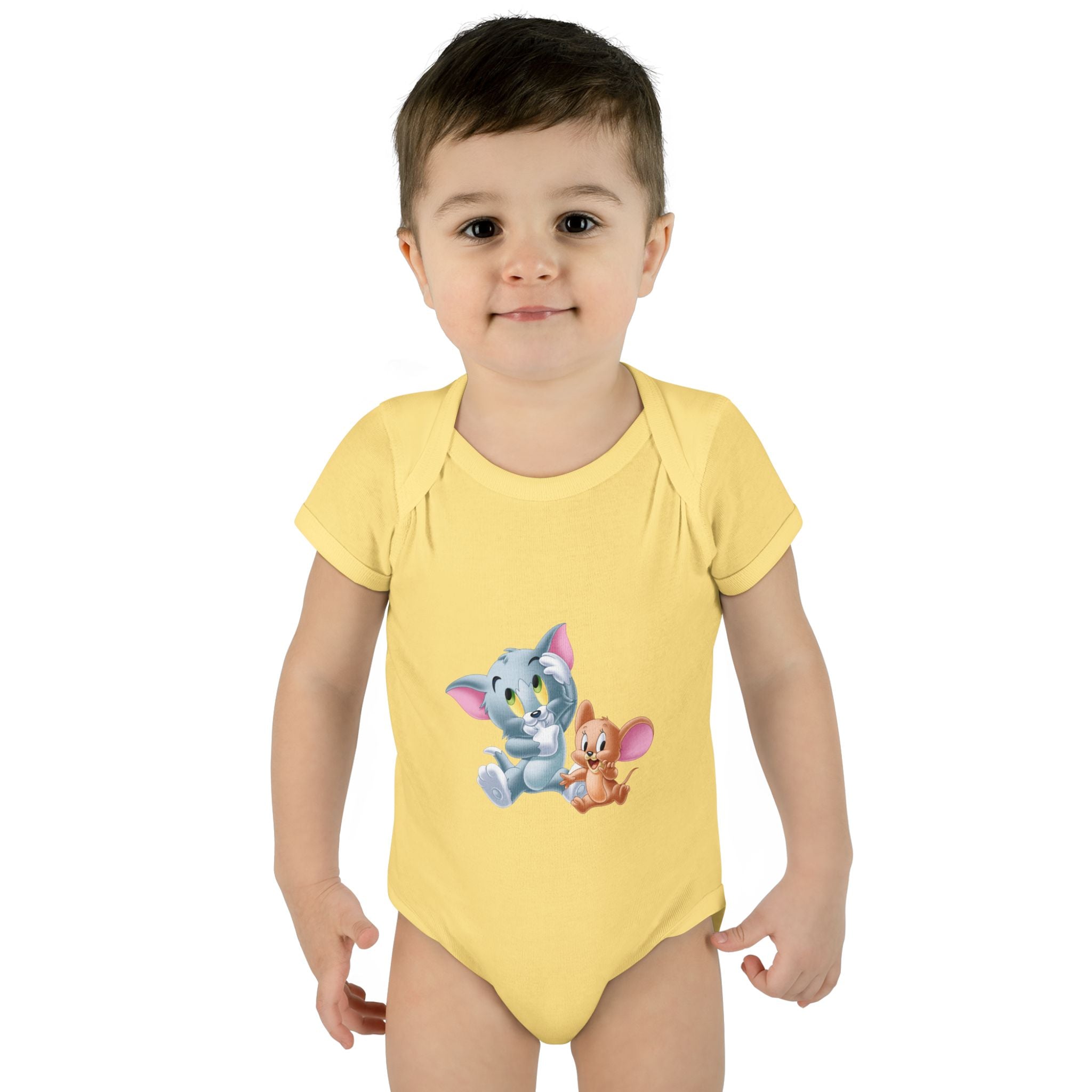 Soft cotton against newborn skin, with a tiny, cheerful illustration right at the chest. This infant bodysuit feels light and breathable, shaped by gentle side seams and a lap shoulder that makes dressing and late-night changes easier. The three-snap closure stays smooth and comfortable, while ribbed binding at the neck, sleeves and legs keeps the shape wash after wash. A tear-away label and printed neck tag eliminate scratchy seams so baby stays calm and cozy. Use it for everyday cuddles, baby photos, or quiet mornings at home — it settles into family routines without fuss.