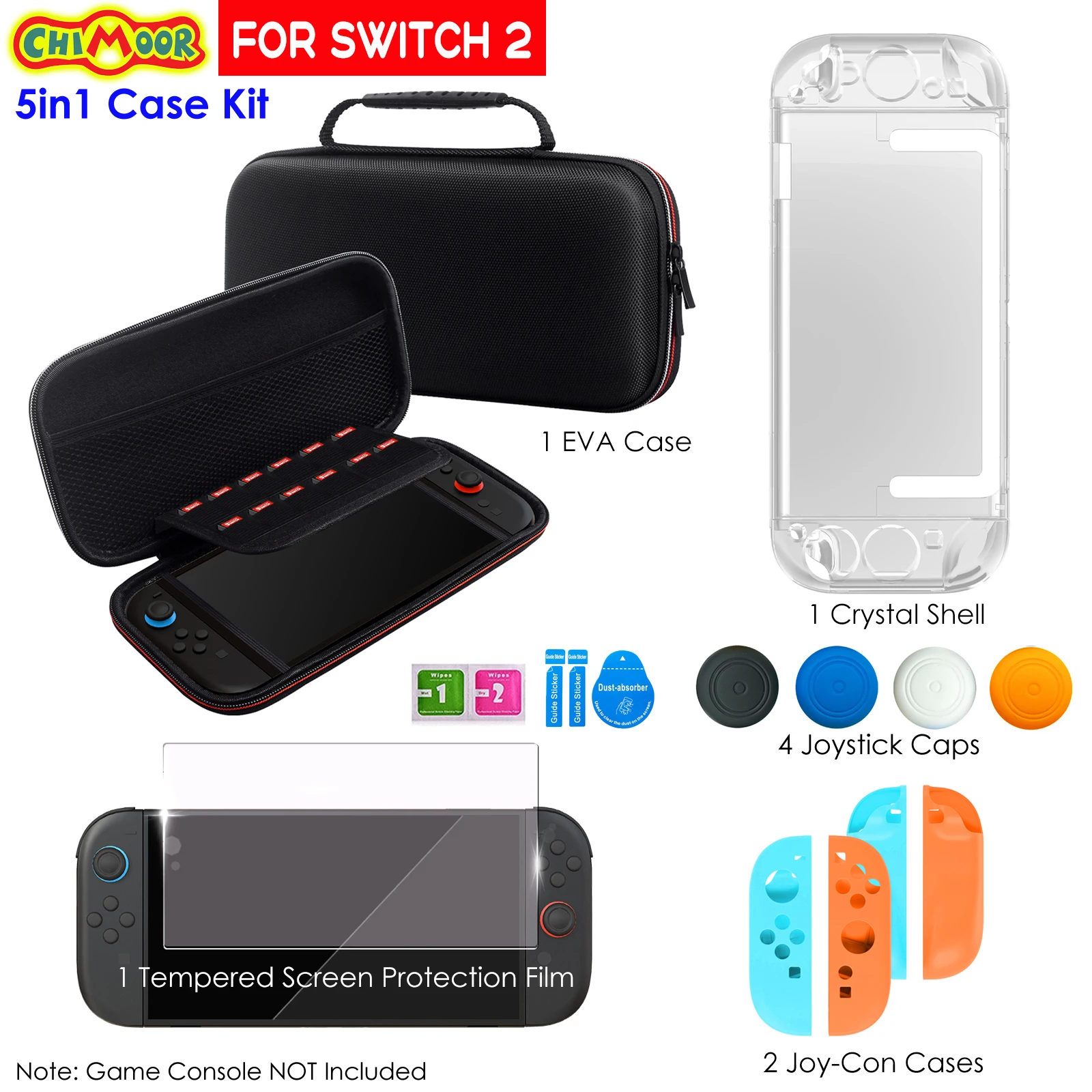 (2), 5in1 Case Kit: 1 EVA Case + 1 Crystal Case + 1 Tempered Screen Protection Film + 4 Silicone Joystick Caps + 2 Silicone Joy-Con Cases