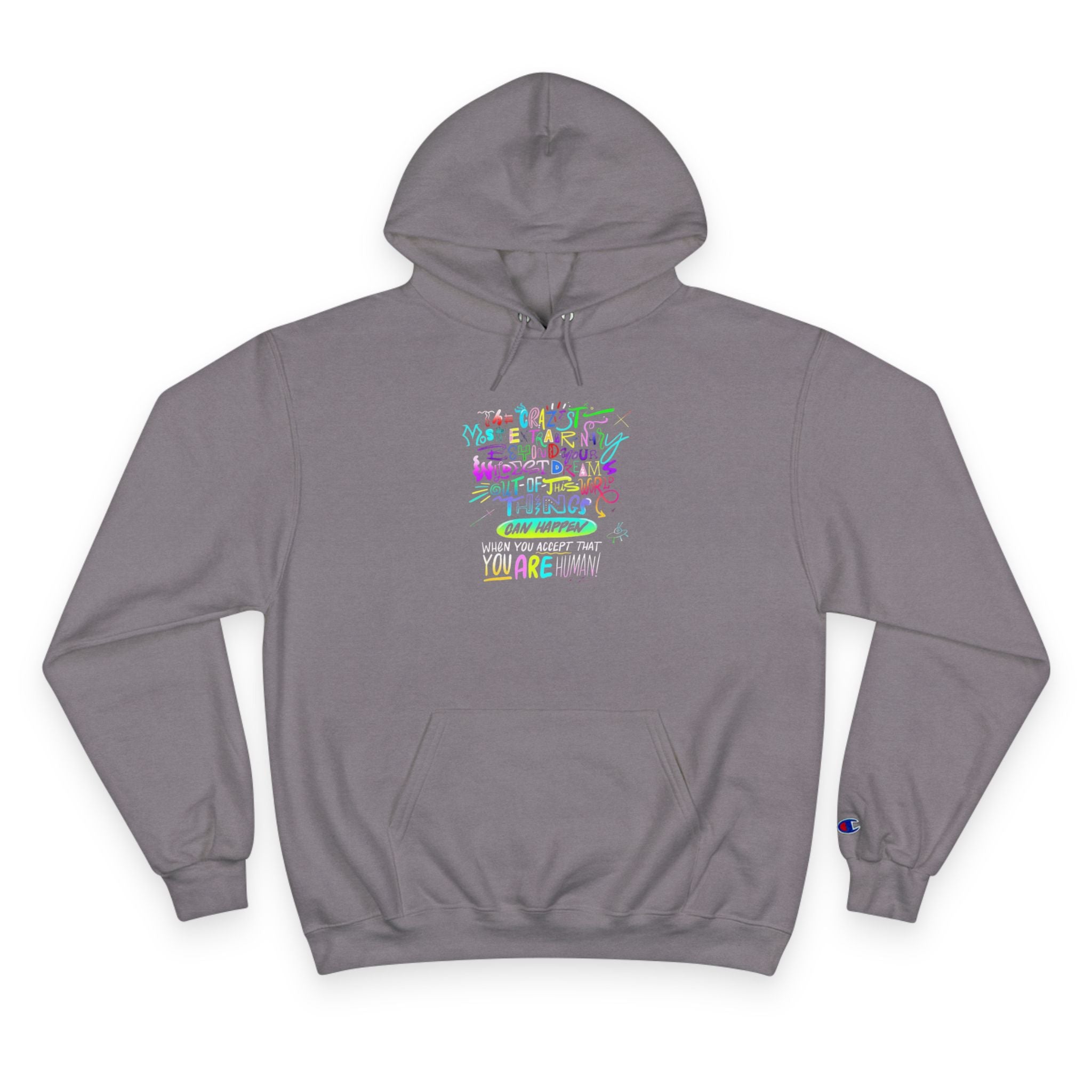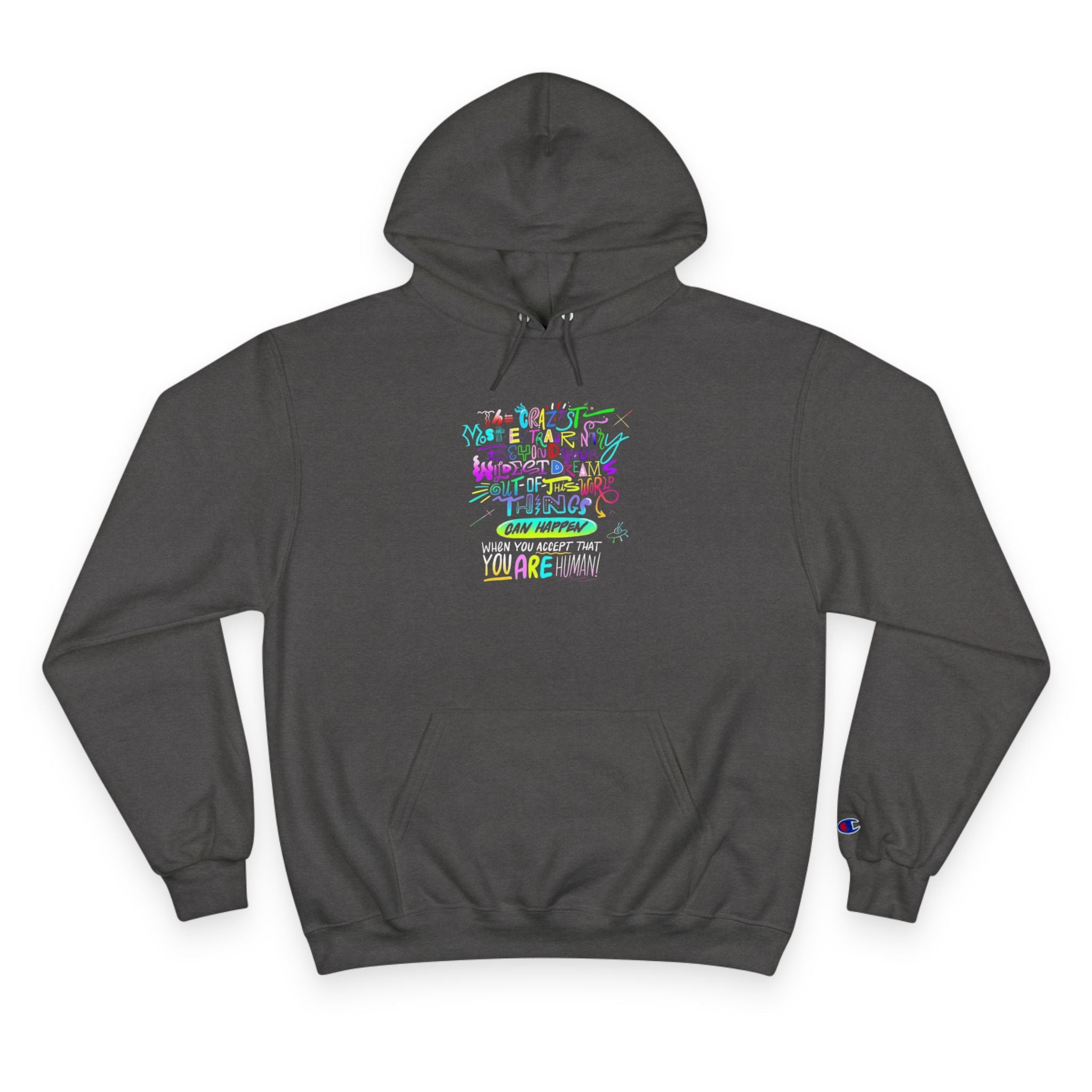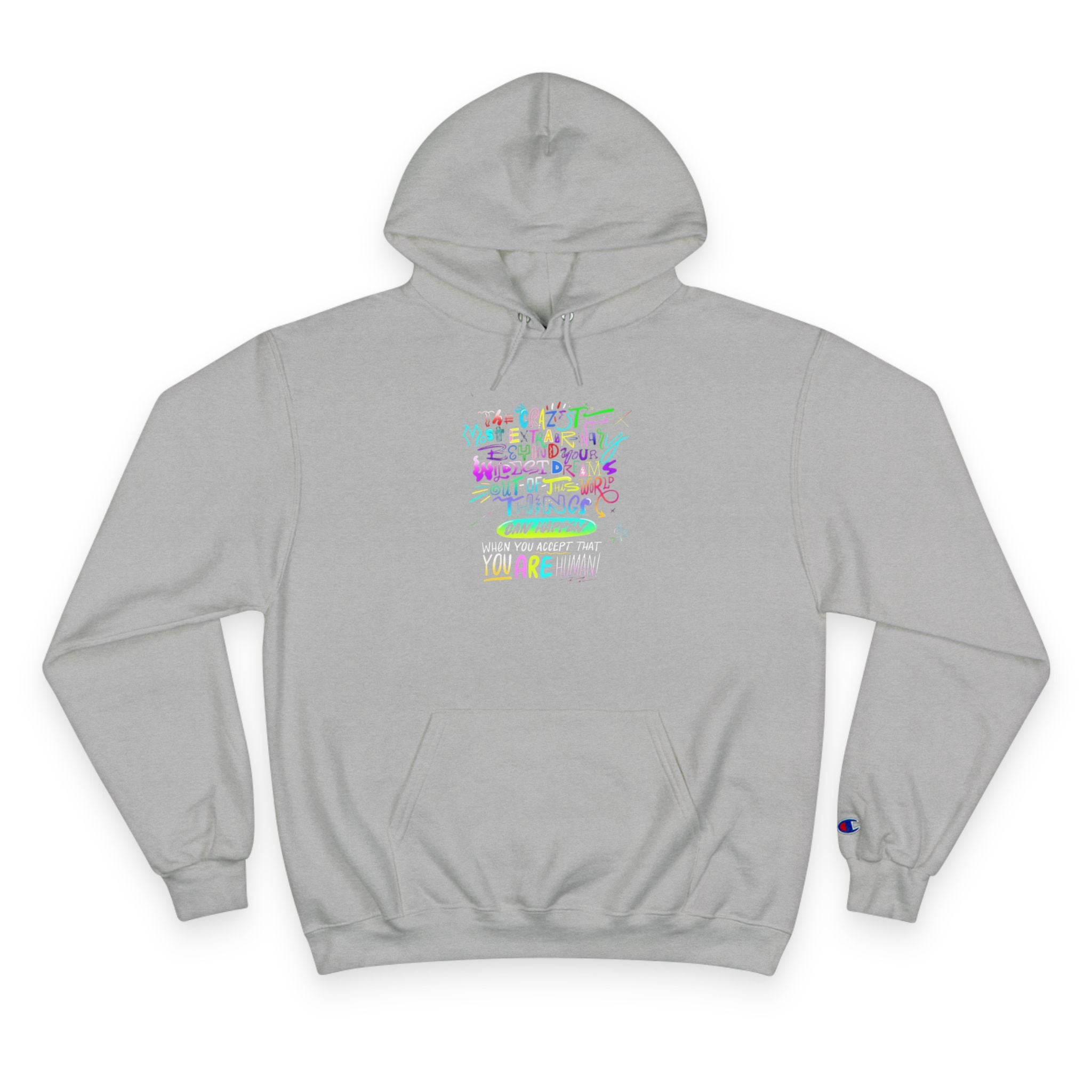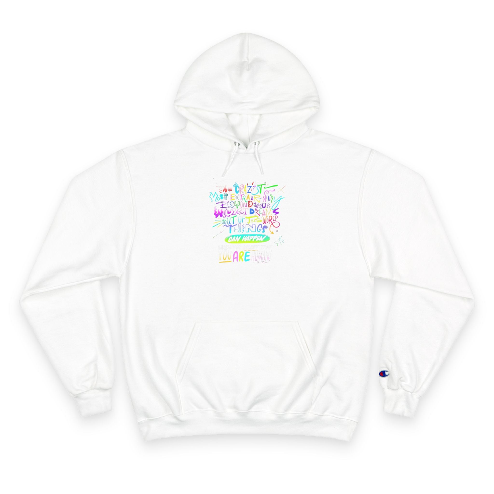 A soft, lived-in hoodie that reads like a gentle note you want to wear. The midweight fabric wraps you in cozy warmth while the adjustable hood and roomy kangaroo pocket hold your hands, keys, or that late-night latte. The subtle, colorful chest artwork brings a light, optimistic touch to the clean white canvas — quiet personality without shouting. Cut with a relaxed, regular fit and knit without side seams, this hoodie balances durability and comfort. Small details like the iconic Champion “C” on the sleeve and a sewn-in care label remind you this is built for everyday wear and repeated adventures.
