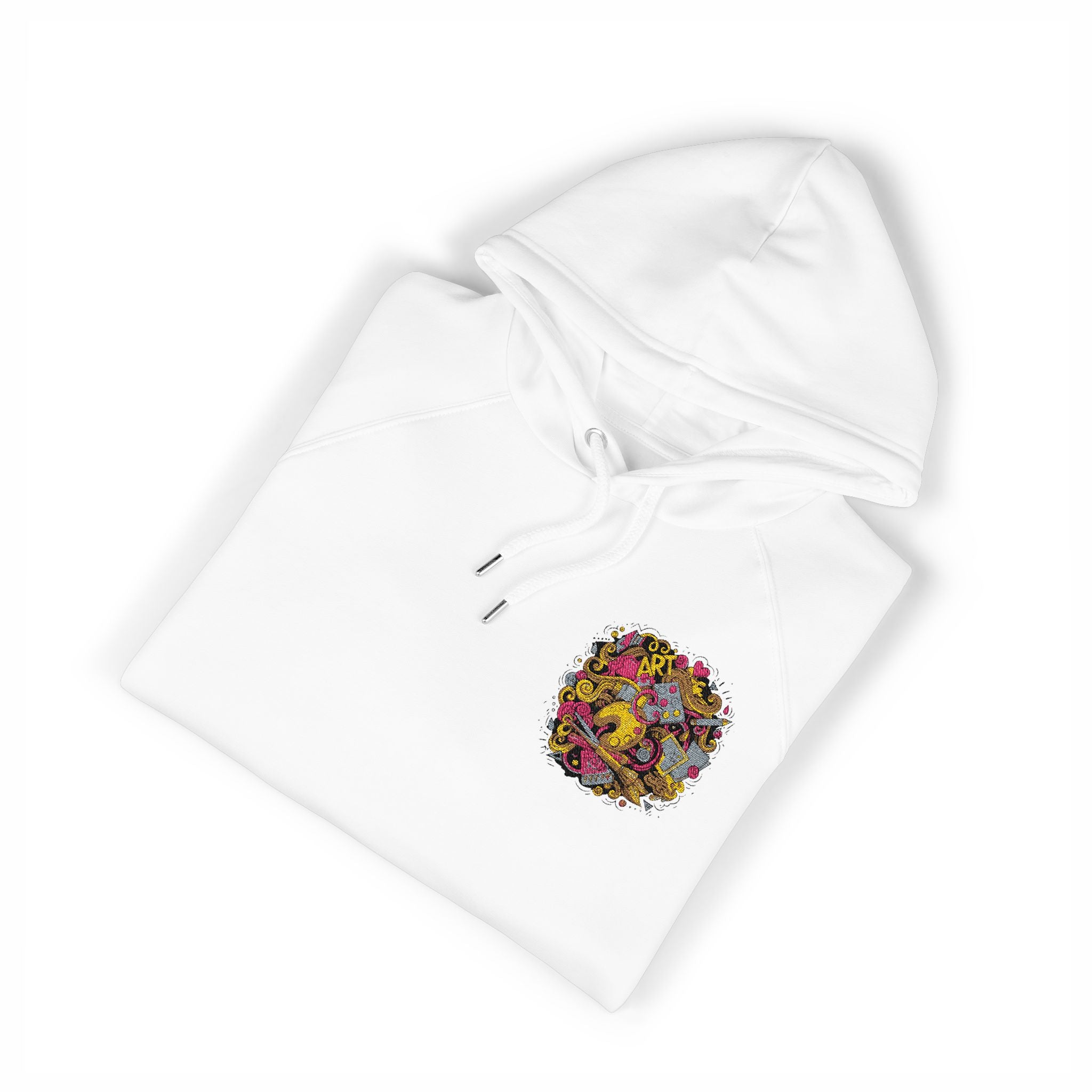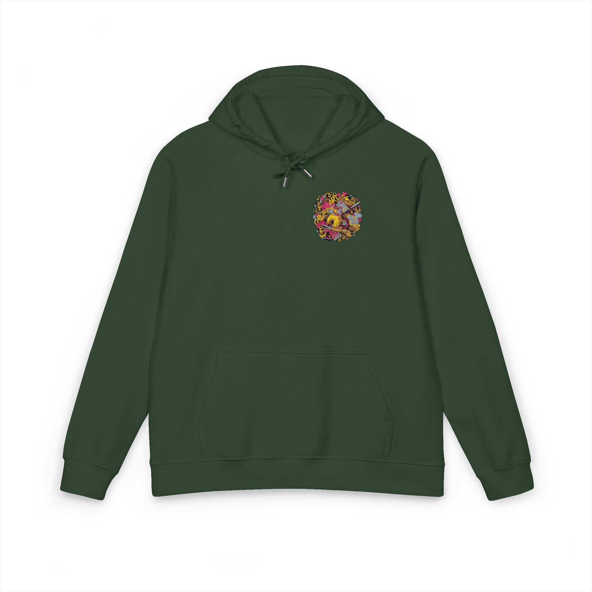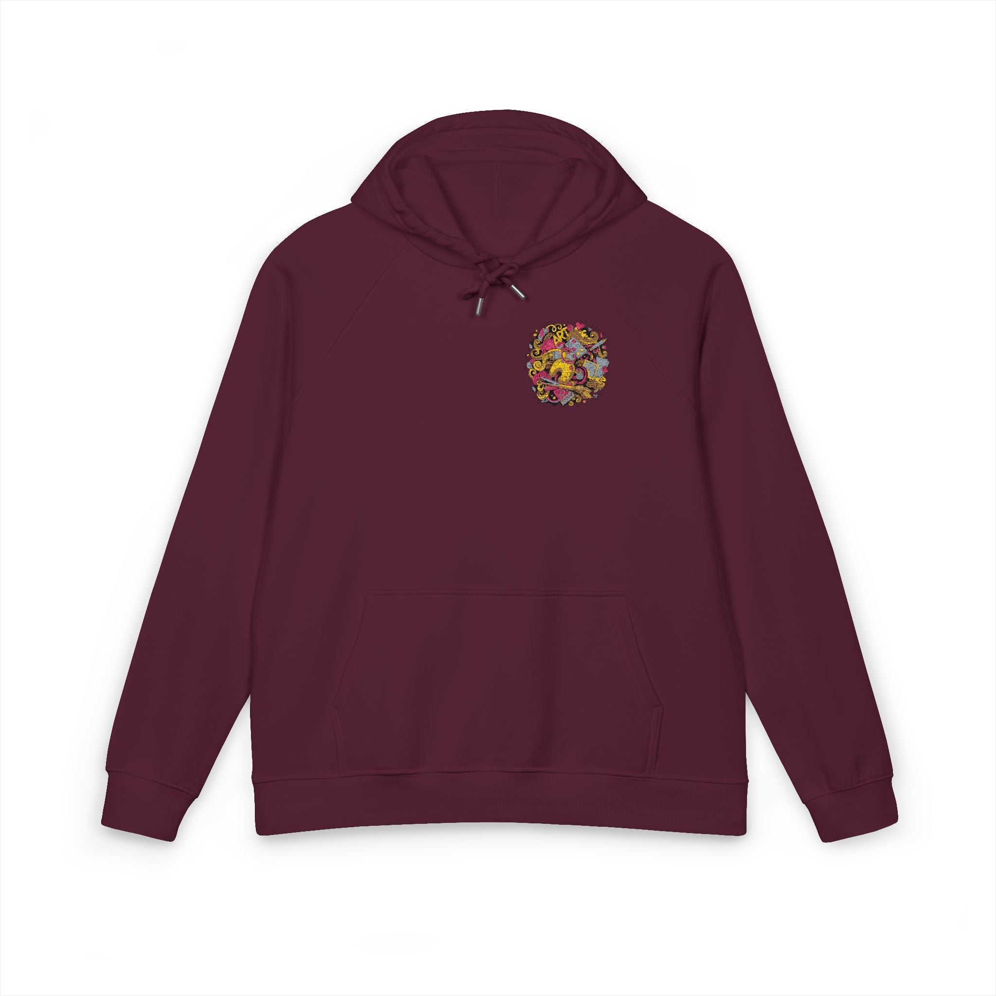 Soft, low-key, and consciously made — this organic raglan hoodie carries a small, colorful embroidered motif over the heart for a quiet pop of personality. The brushed interior and jersey-lined hood cradle warmth without bulk, while raglan sleeves and a regular cut keep movement easy during slow mornings, bike rides, or tucked-in coffee shop afternoons. Drawstrings with metal eyelets and 1x1 ribbed cuffs hold shape after wear, and the self-fabric necktape prevents stretching so the hoodie keeps feeling like your favorite layer. Thoughtfully certified fabrics (GOTS, GRS, OCS, OEKO-TEX) and PETA-approved vegan production mean you’re choosing comfort with care. Wear it when you want something that feels gentle, honest, and a little playful — a quiet everyday companion.