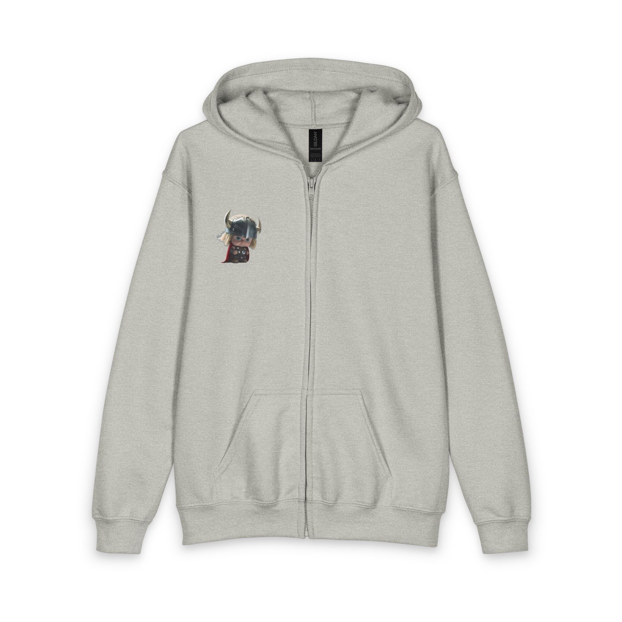 Lightweight warmth and everyday toughness meet in this full-zip youth hoodie. The clean black canvas puts a small, playful graphic front-left where it can be seen without overwhelming — great for kids who like subtle character and a touch of attitude. The unlined hood and classic fit move with active days: school, skate sessions, and backyard adventures. The pouch pocket keeps small treasures (or chilly hands) close, while the durable zipper and tear-away tag keep comfort at the front of every wear. It’s a casual layer that blends durability and ease so kids can keep exploring without fuss.