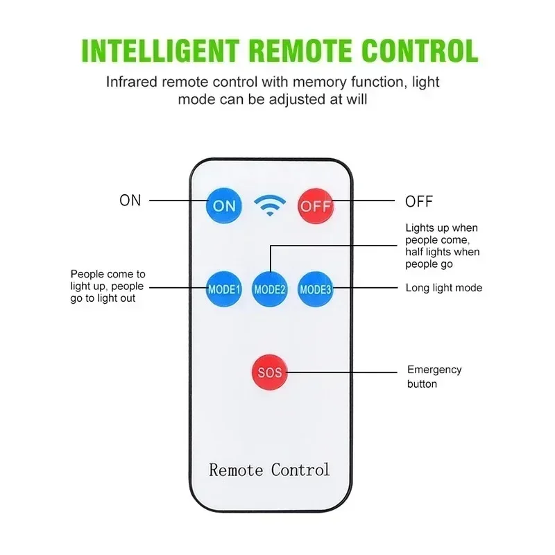 ※ 3 modes, human body sensing + remote control, sensing diameter range 5-10 meters. You can use the remote control to turn lights on and off and switch modes within a range of 8-10 meters.