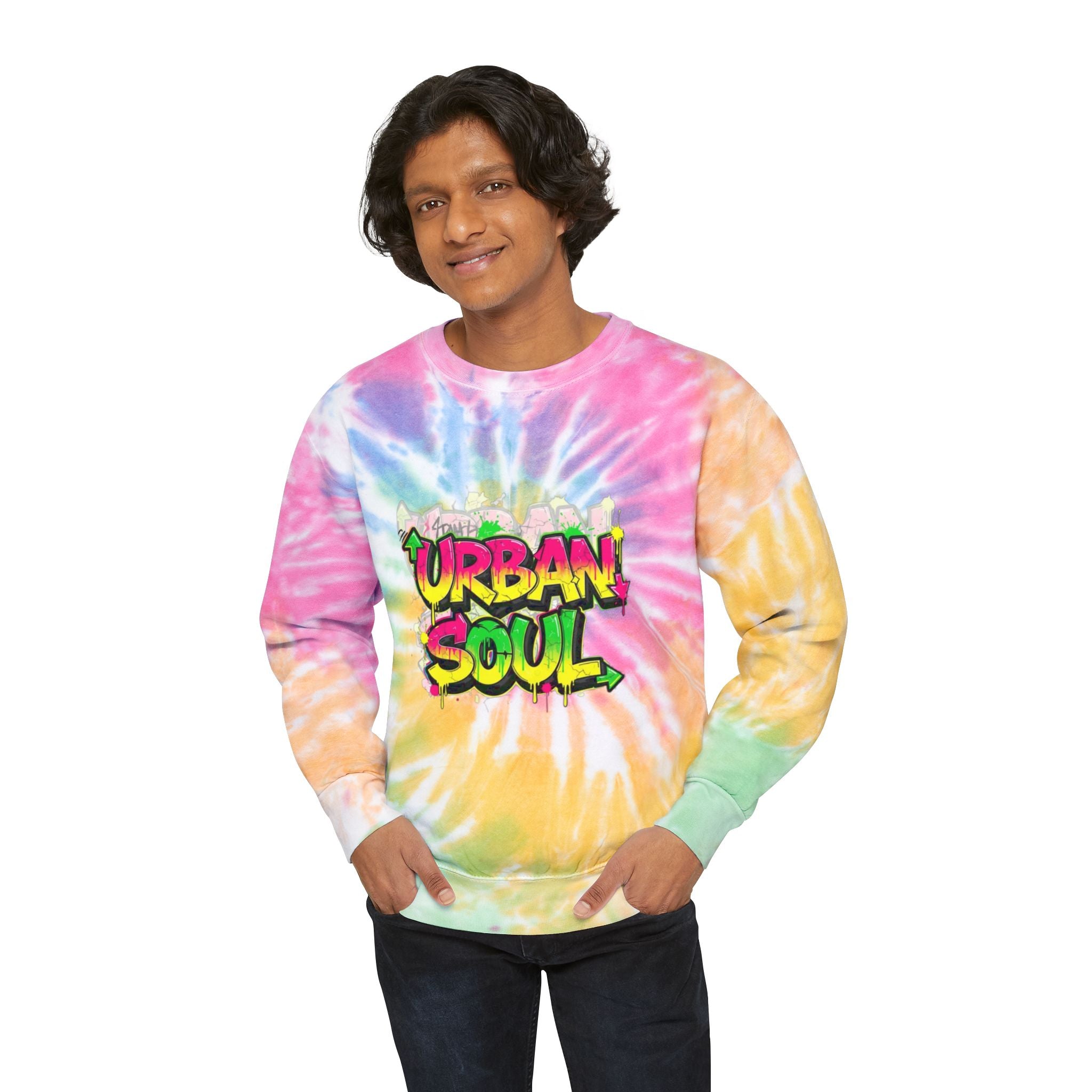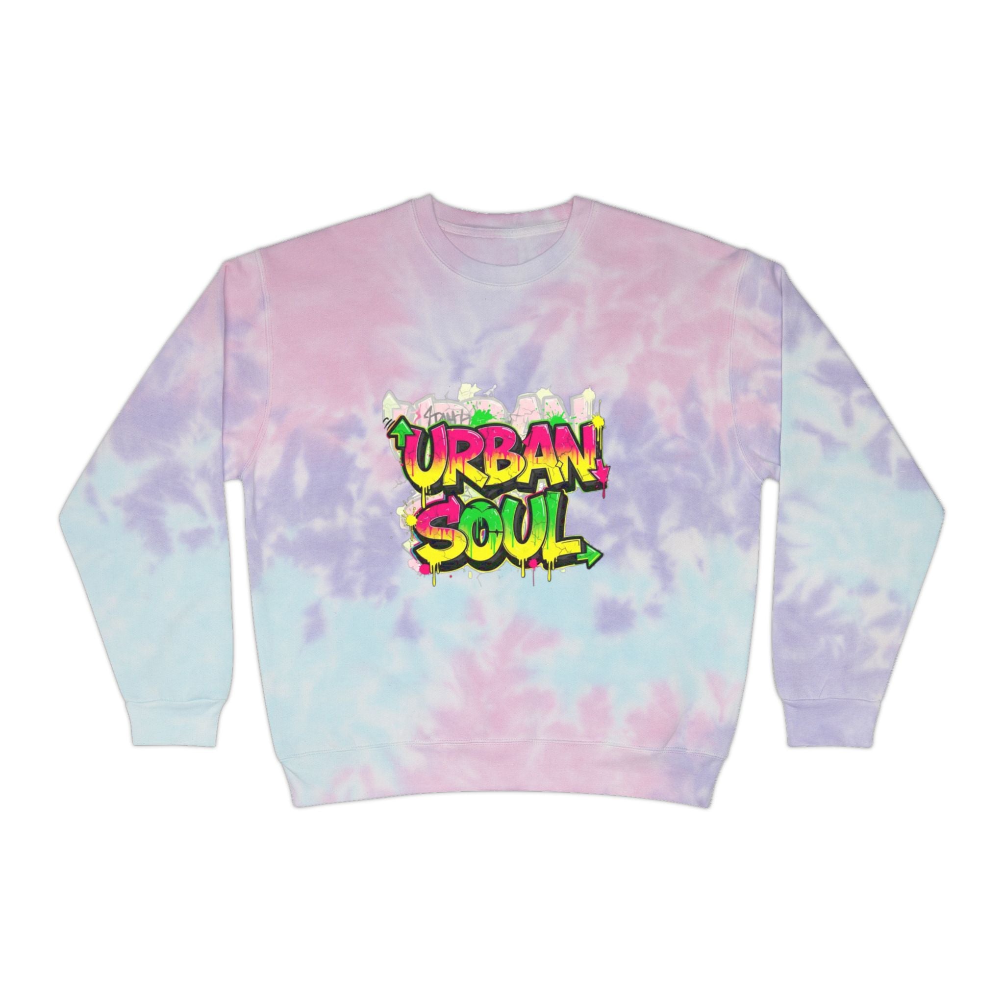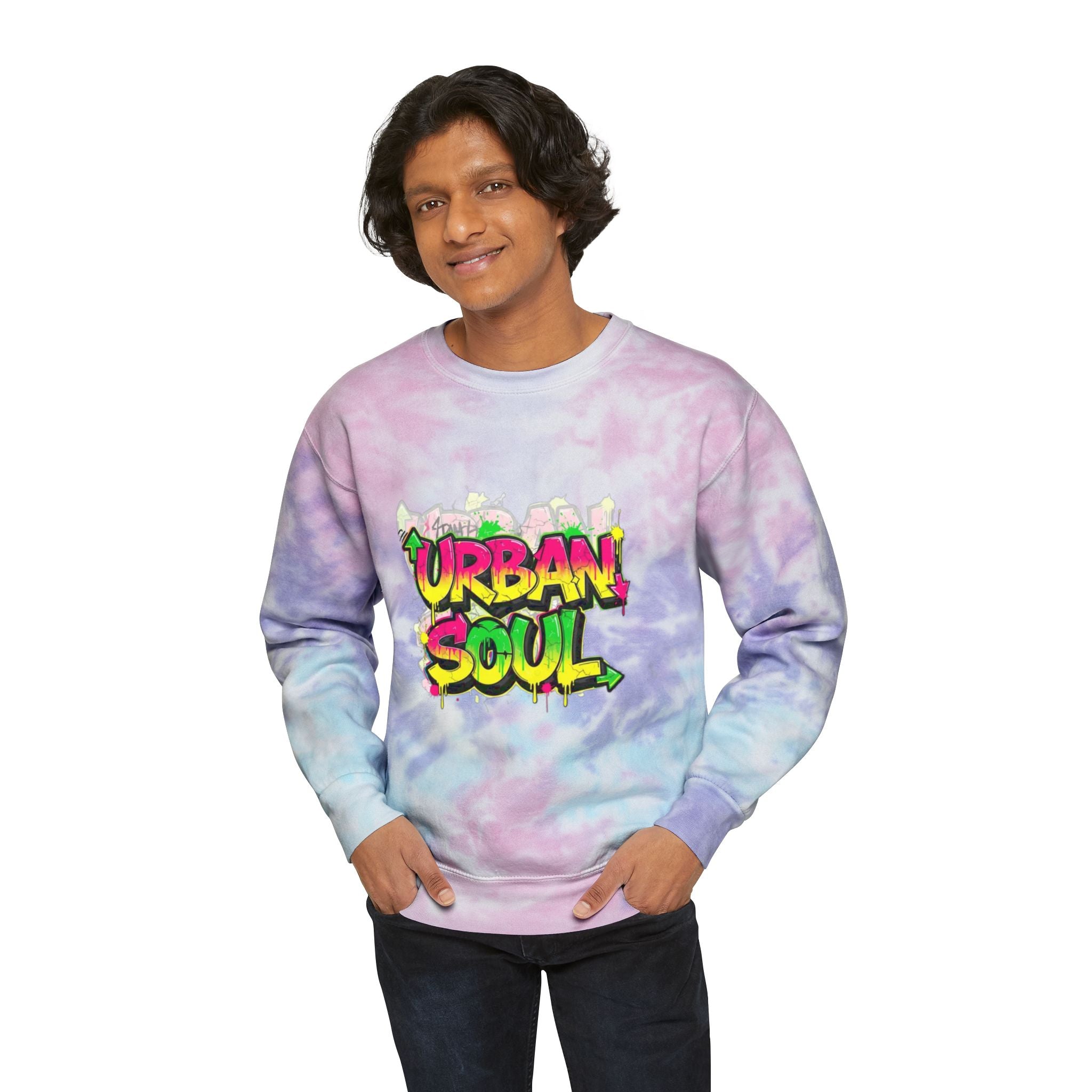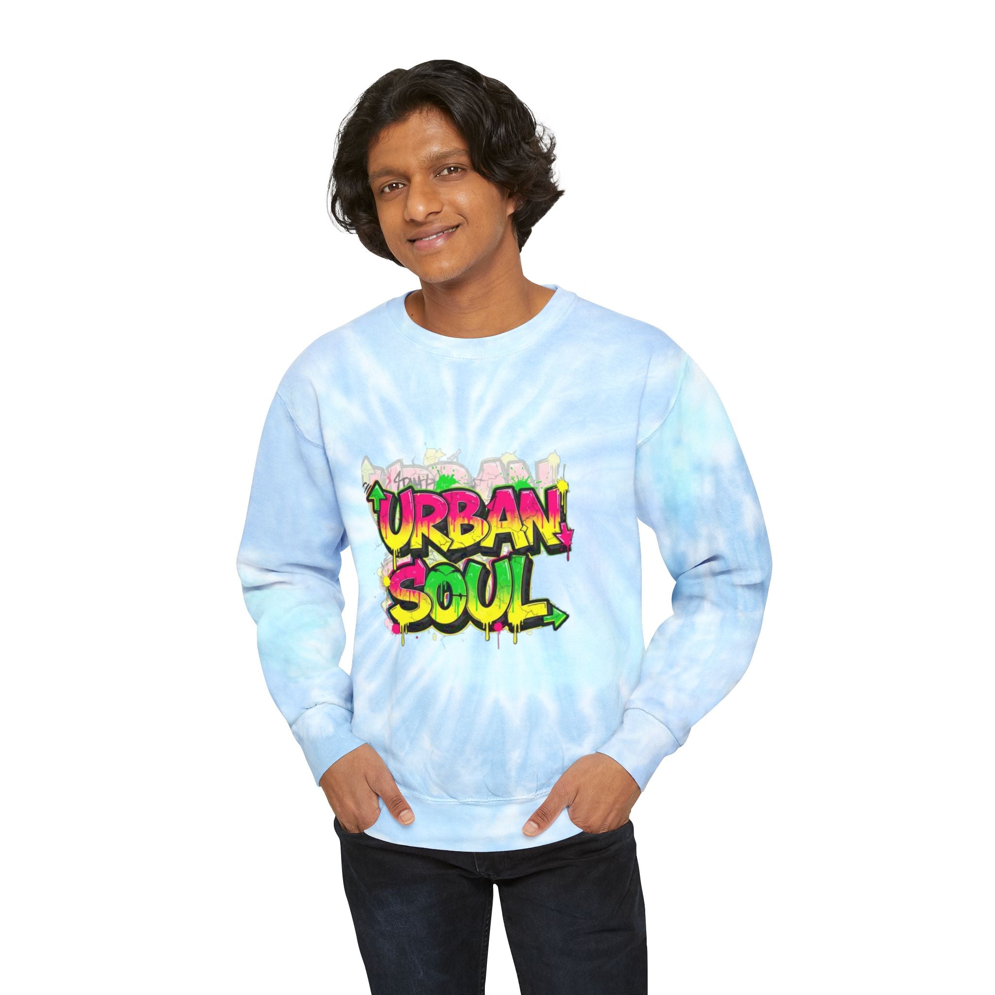 This relaxed-fit sweatshirt brings soft, hand-dyed tie-dye vibes to everyday streetwear. The pale sky-blue spiral wash feels like a calm morning sky, while the bold graffiti-style “Urban Soul” chest graphic adds bright, city energy. Wear it on slow weekend walks, late-night meetups, or while sketching and swapping playlists with friends — it’s lightweight enough for layering and sturdy enough to last season after season. The fabric’s ringspun cotton gives a smooth, cozy touch against the skin, and each piece’s unique dye pattern means your sweatshirt is truly one of a kind.